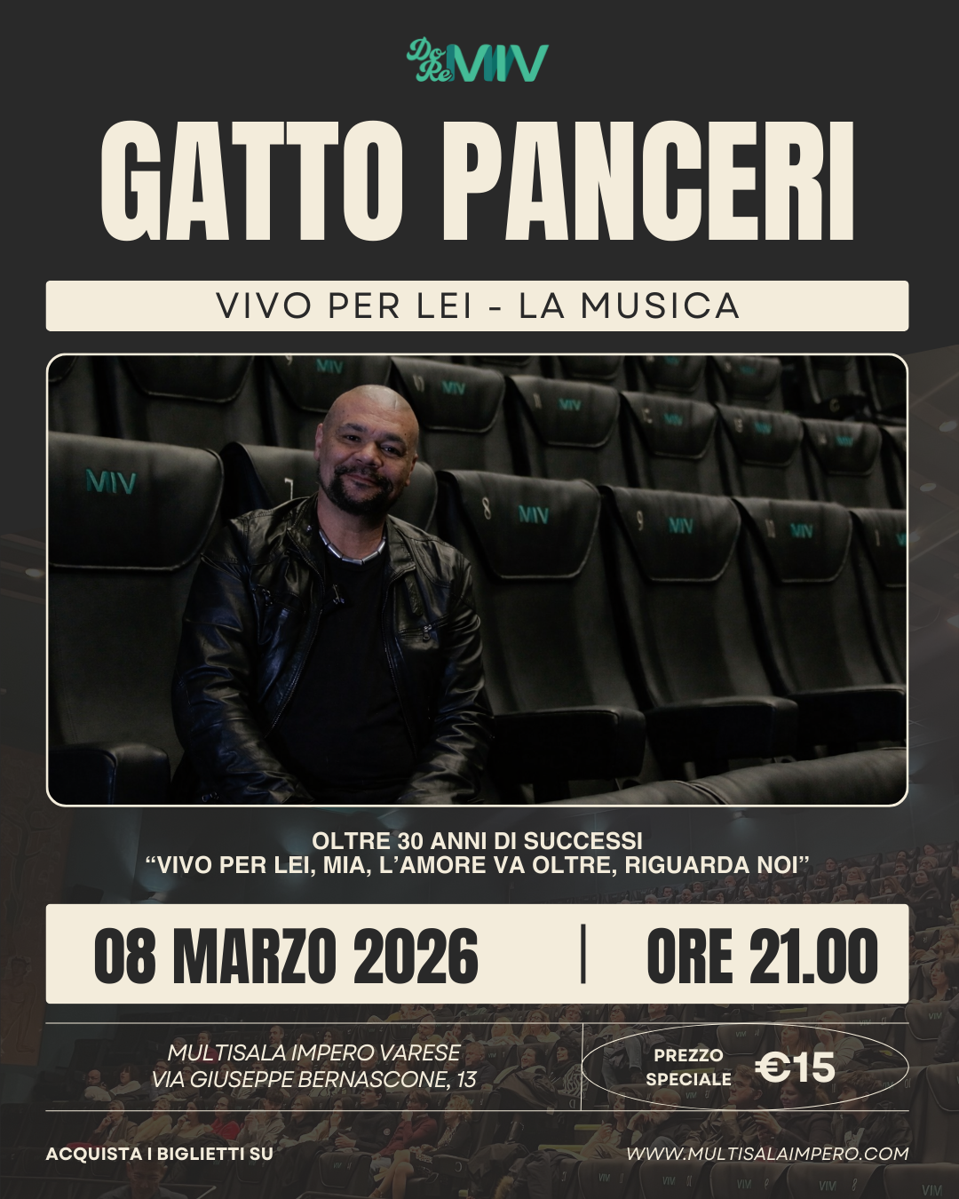 Gatto Panceri “Vivo per lei, la musica” 8 marzo 2026 | Multisala Impero Varese Ci sono canzoni che non si ascoltano soltanto.Si vivono.Si attraversano.Si portano dentro come una carezza che non smette di vibrare. L’8…